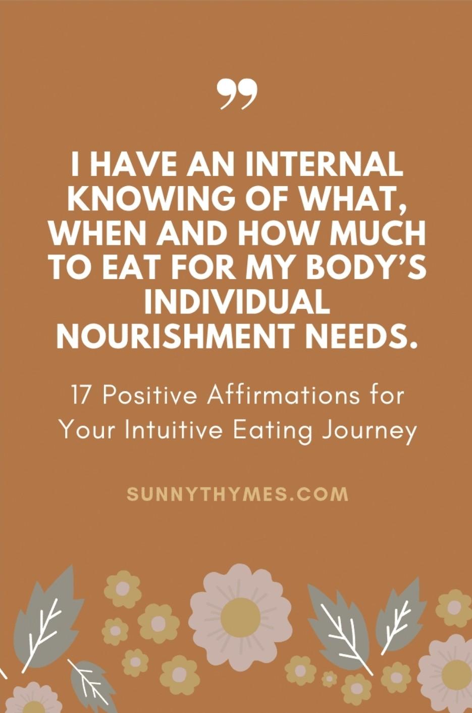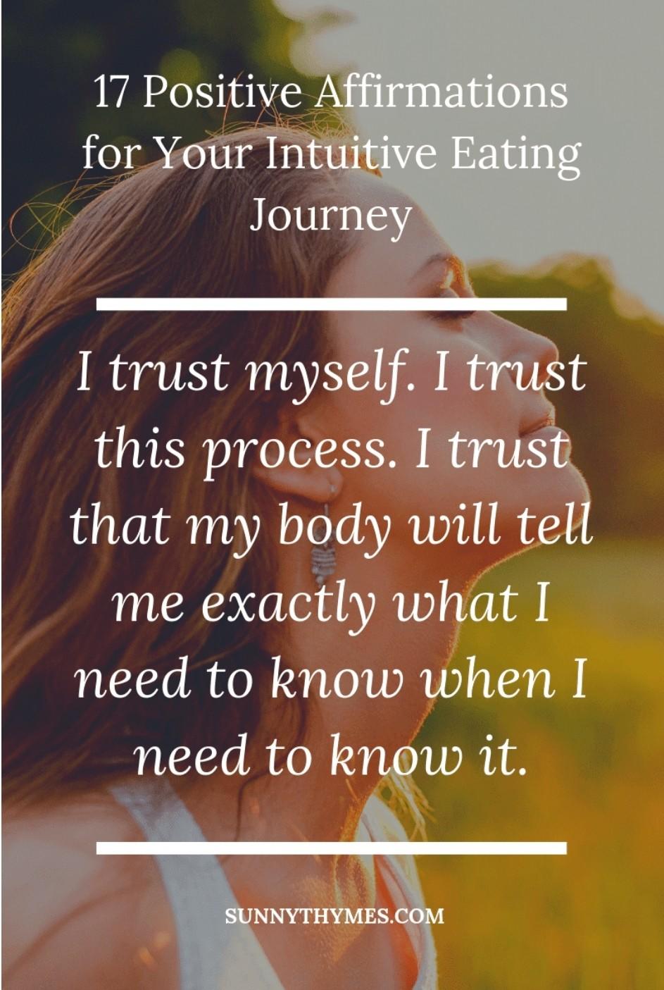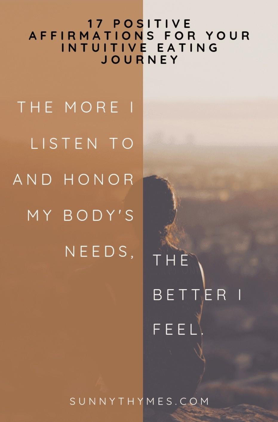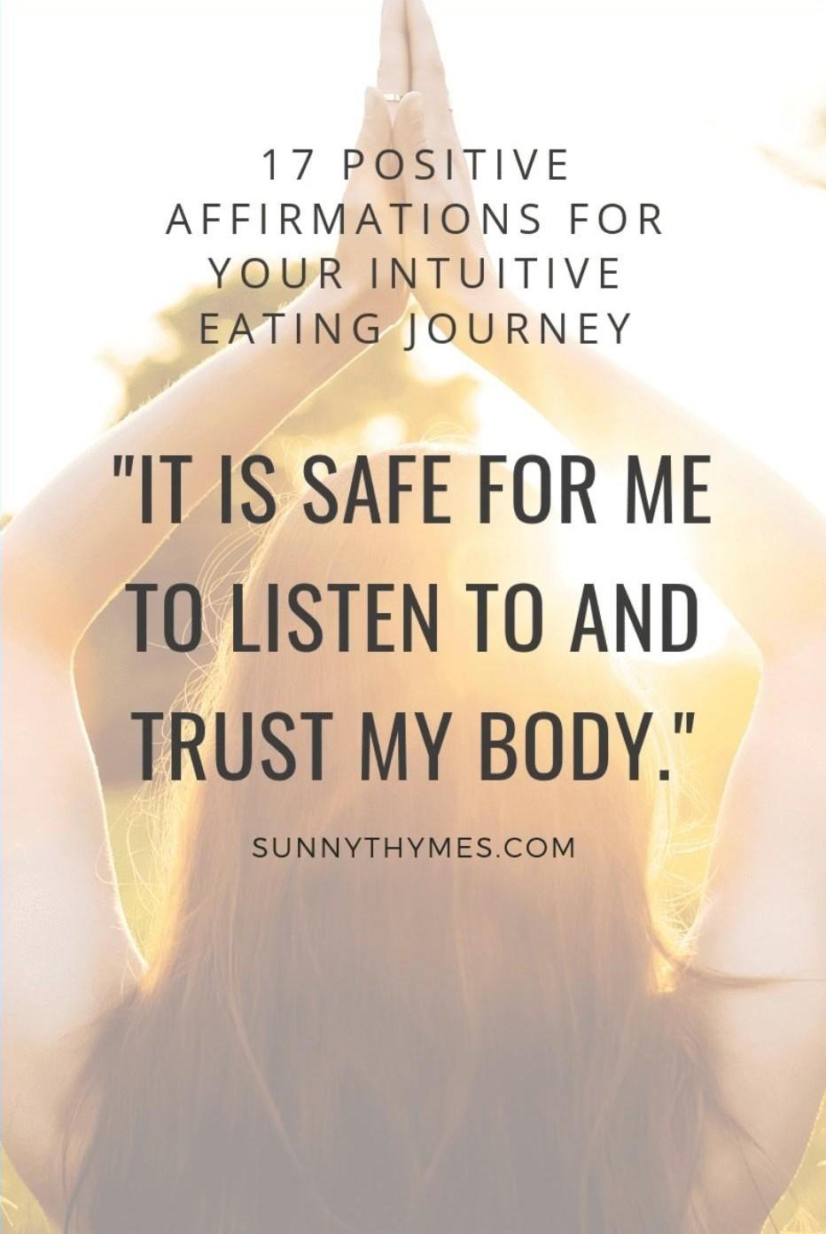 Our subconscious minds literally don’t know the difference between real and imagined. The brain perceives intuitive eating affirmations as truth and generates thoughts and feelings in alignment with that. Those thoughts and feelings then begin to generate the actions that someone who trusts and honors their body would take which then creates more positive outcomes like feeling confident and healthy.