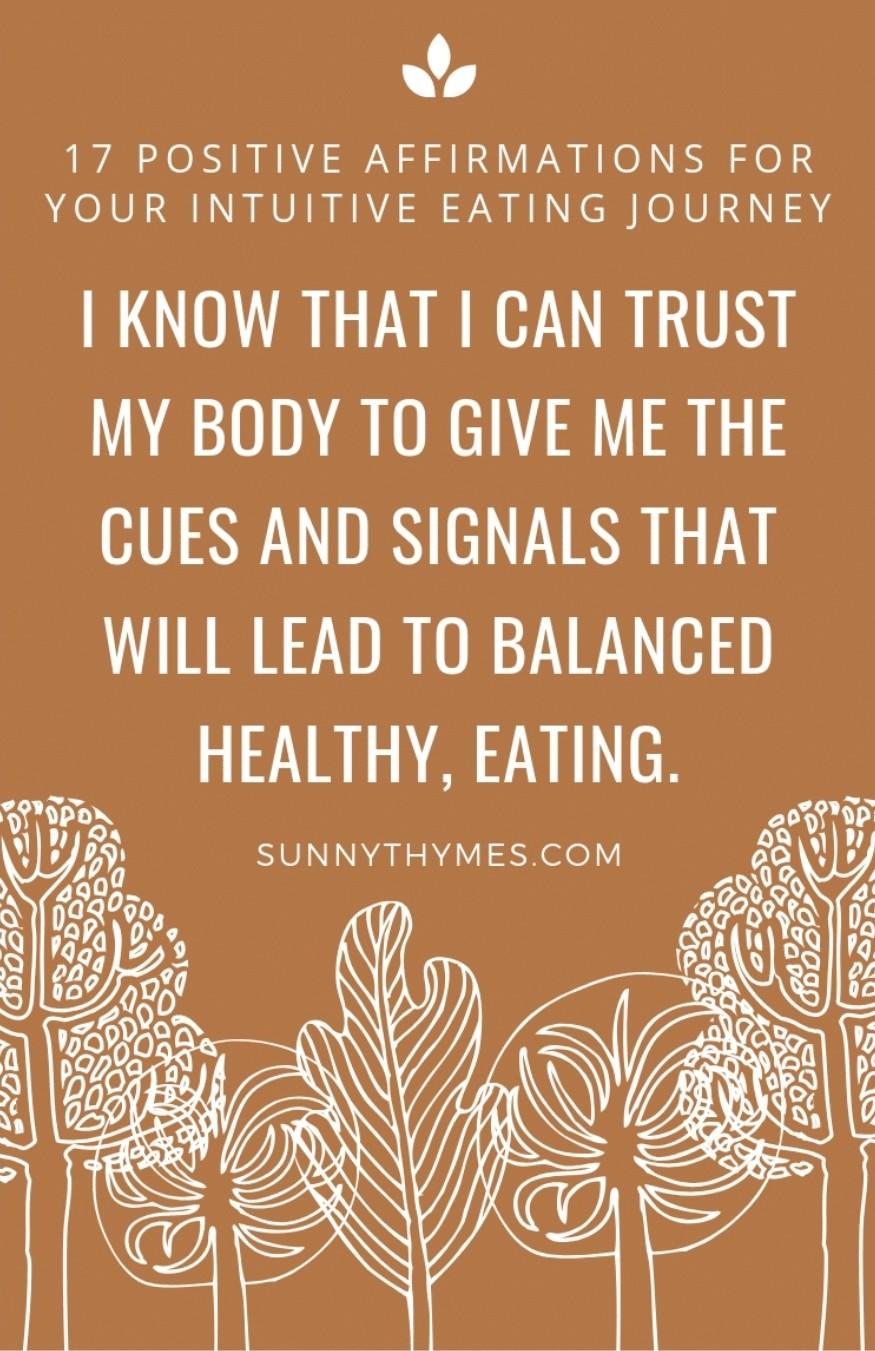 When you think a thought, your brain perceives the information as truth and prepares you for the action that should immediately follow the thought. For example, if you think to yourself, “I know that I can trust my body to give me the cues and signals that will lead to balanced healthy, eating.”, your brain essentially hears “trust my body” and “balanced, healthy eating” and starts firing off all the connections to create outcomes in alignment with that.